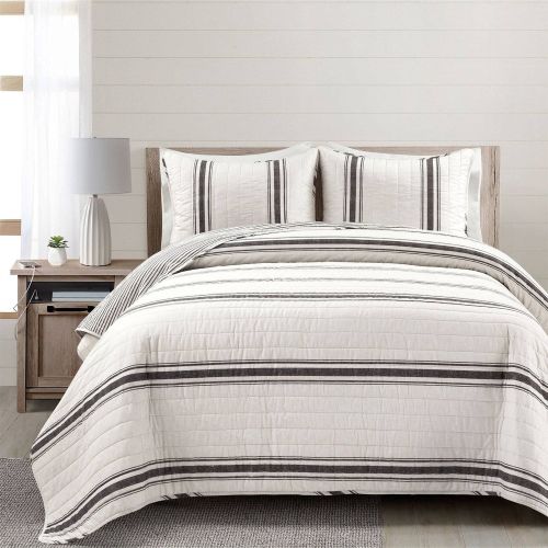 This Farmhouse Stripe Reversible Cotton Quilt Set includes a reversible 100% cotton quilt and 2 matching reversible pillow shams. The background color is a creamy off-white color. The quilt and the sham in this Farmhouse Stripe Reversible Cotton Quilt Set are both safe to machine wash and tumble dry. For best results, please refer to the product labels for full care instructions.