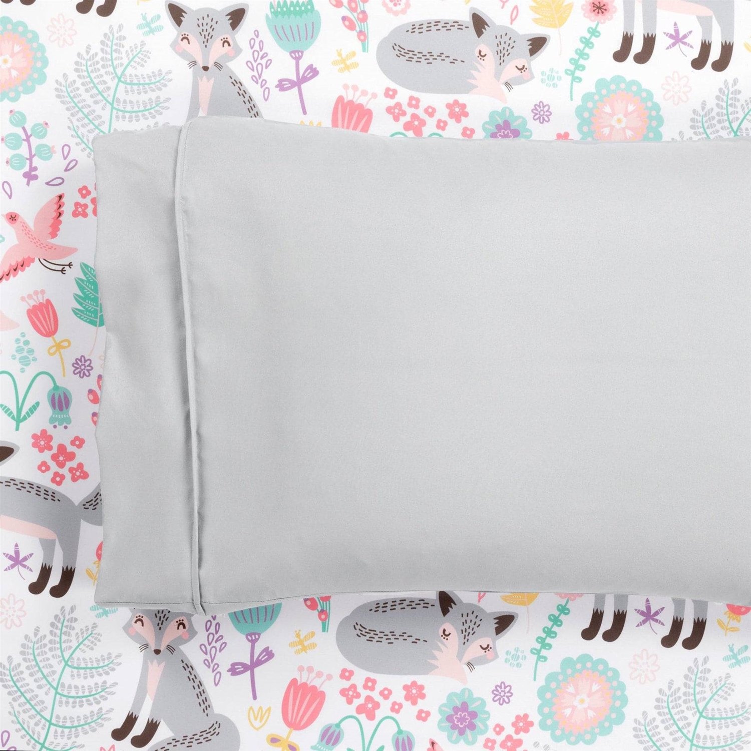 You'll love this whimsical sheet set for your kid's bedroom. Designed to keep your child cool and comfy all year long, this Full Size Pink Grey Fox Soft 6 Piece Sheet Set is soft and built to last for many sleeps. Coordinate with the matching bedding set, throw and window treatments, or style independently. Decorate your child's bedroom by starting with the basics - the sheets. This complete Pixie Fox Soft Sheet Set is printed with whimsical woodland creatures and fun forest finds. Each piece of this set is made with naturally hypoallergenic fabric that is so soft to the touch. This Pixie Fox Soft Sheet Set is durable and will last many restful nights. Comfort is key with bed sheets, and this material is breathable and sure to keep your child at the perfect temperature throughout the night. The adorable and light hearted pattern printed on this Pixie Fox Soft Sheet Set pairs perfectly with its coordinating bedding set or it can be styled independently. A solid color textured bedding would also look lovely with these printed sheets. This Sheet Set includes 1 flat sheet, 1 fitted sheet, and two styles of pillowcases: 2 with matching print and 2 in solid color. The full size is a 6-piece set with one of each. The fitted sheet has a 14-inch pocket.