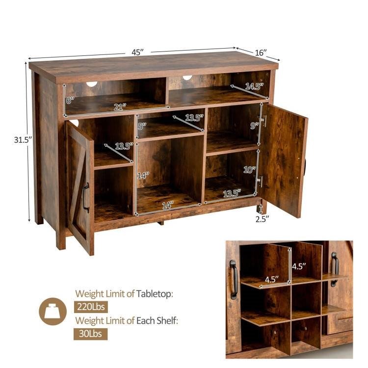 This Rustic Brown Detachable 9 Bottle Wine Rack Kitchen Buffet Storage Cabinet features a detachable 9-bottle wine rack that offers an ideal storage solution for your wine collection. Features ample storage space with 3 open compartments and 2 door cabinets for concealed storage. Shelves inside are adjustable in height, which help customize an ideal storage space for your private items. Made of durable engineered wood, the kitchen cupboard is sturdy and durable. The 4 legs are fitted with anti-skid pads to provide excellent stability. And the bottom is equipped with extra support plate to prevent the cabinet from shaking or wobbling.
