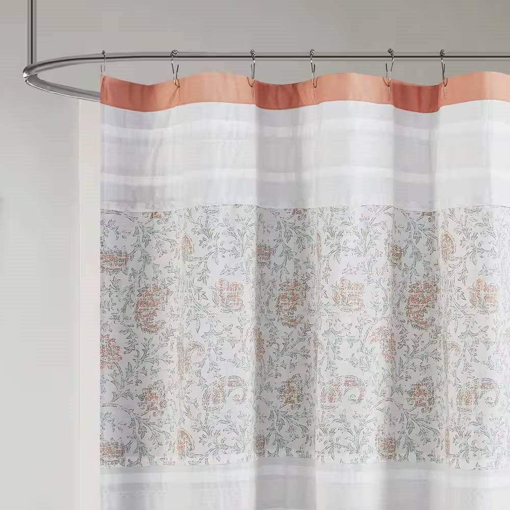 For a charming and stylish touch to your bathroom, this 72 x 72-inch Cotton Shower Curtain with Coral Orange Blue White Paisley Pattern holds all of the perfect elements to do shabby chic the right way. A mixture of coral, orange, and hints of green are printed in a paisley design alongside pin tucked white fabric that is separated by beautiful lace taping. Finished with 12 button holes at the top makes this shower curtain easy to assemble hooks and simply hang on any standard rod (hooks and rod not included). This shower curtain is also OEKO-TEX certified, meaning it does not contain any harmful substances or chemicals, ensuring quality comfort and wellness. Each shower curtain measures 72x72" and is machine washable for easy care; to keep this shower curtain in the best condition a water repellant liner is highly recommended (liner not included and should be purchase separately).