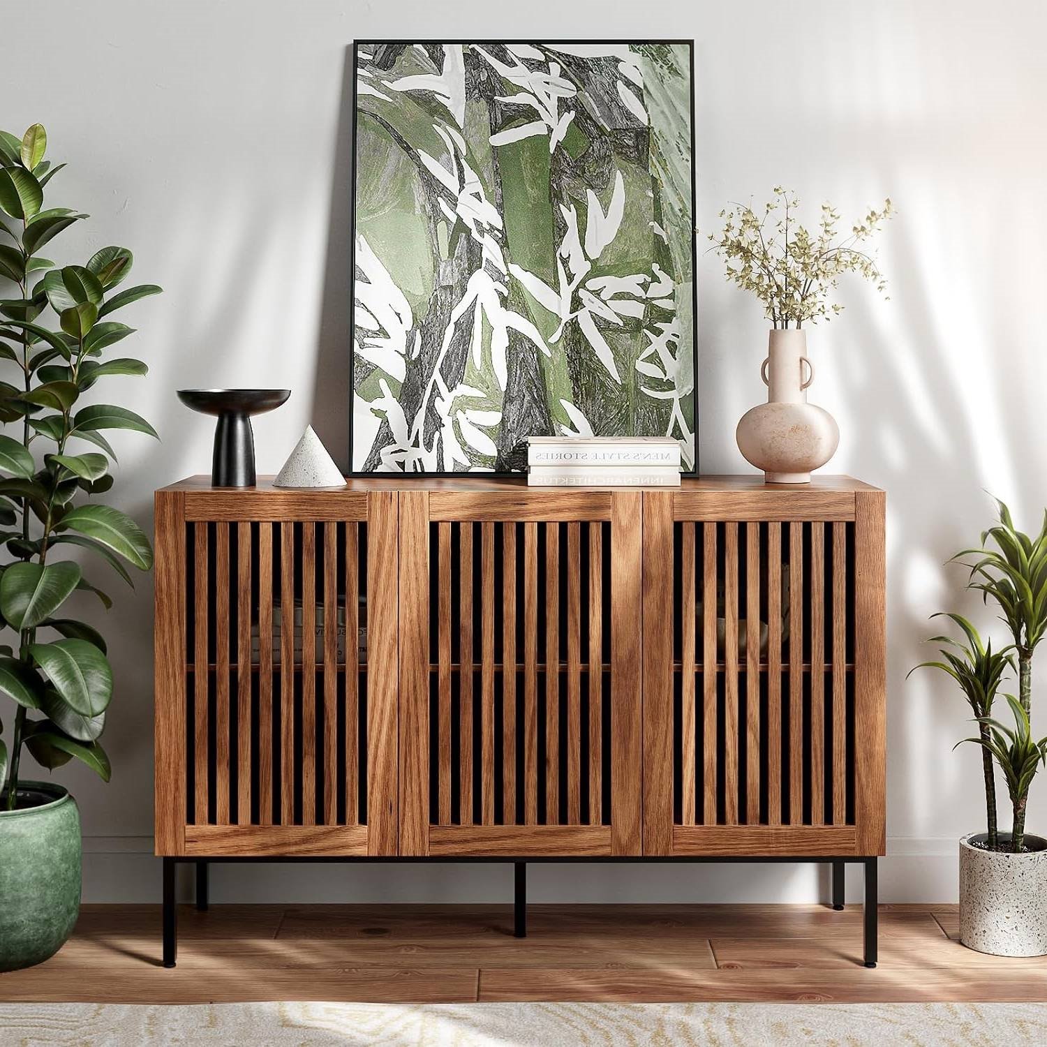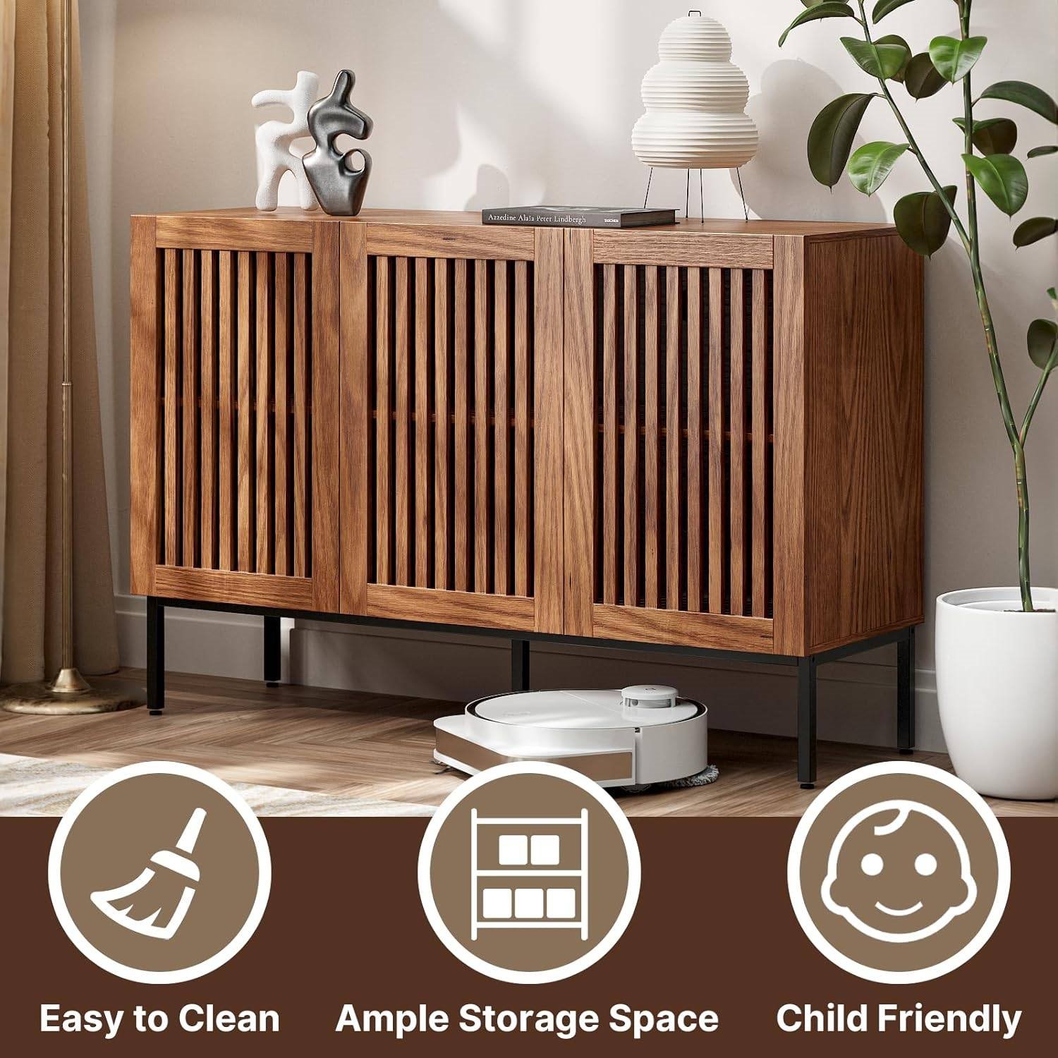 This Mid-Century Modern Dining Buffet Storage Cabinet Sideboard in Brown Wood Finish, adorned with grille-striped doors, embodies a unique design that effortlessly blends the rustic charm of the countryside with modern elegance. Not only a buffet cabinet but also an eye-catching storage sideboard. It serves as a captivating focal point in your living room, dining room, or office, adding a touch of style and functionality to any space. Boasting four spacious compartments and adjustable shelves, our storage cabinet offers ample room for all your belongings. Organize and stash away everything from books to clothes, toys to home decor, all while maintaining a tidy and stylish appearance. Brown accent cabinet whole is made of high-quality MDF wood, which is waterproof, scratch-resistant and wear-resistant. Metal legs is sturdy and stable, long-lasting construction and easy to clean. which is strong enough to stand the microwaves, mixers, blenders and even coffee machines. At the same time,it will separate the cabinet from the ground to prevent moisture. The Mid-Century Modern Dining Buffet Storage Cabinet Sideboard in Brown Wood Finish comes with the tools needed for installation and clear and concise instructions. You can quickly assemble in 20 minutes. Overall Dimensions: 47.2î(L) x 15.3î(W) x 31.5î(H).