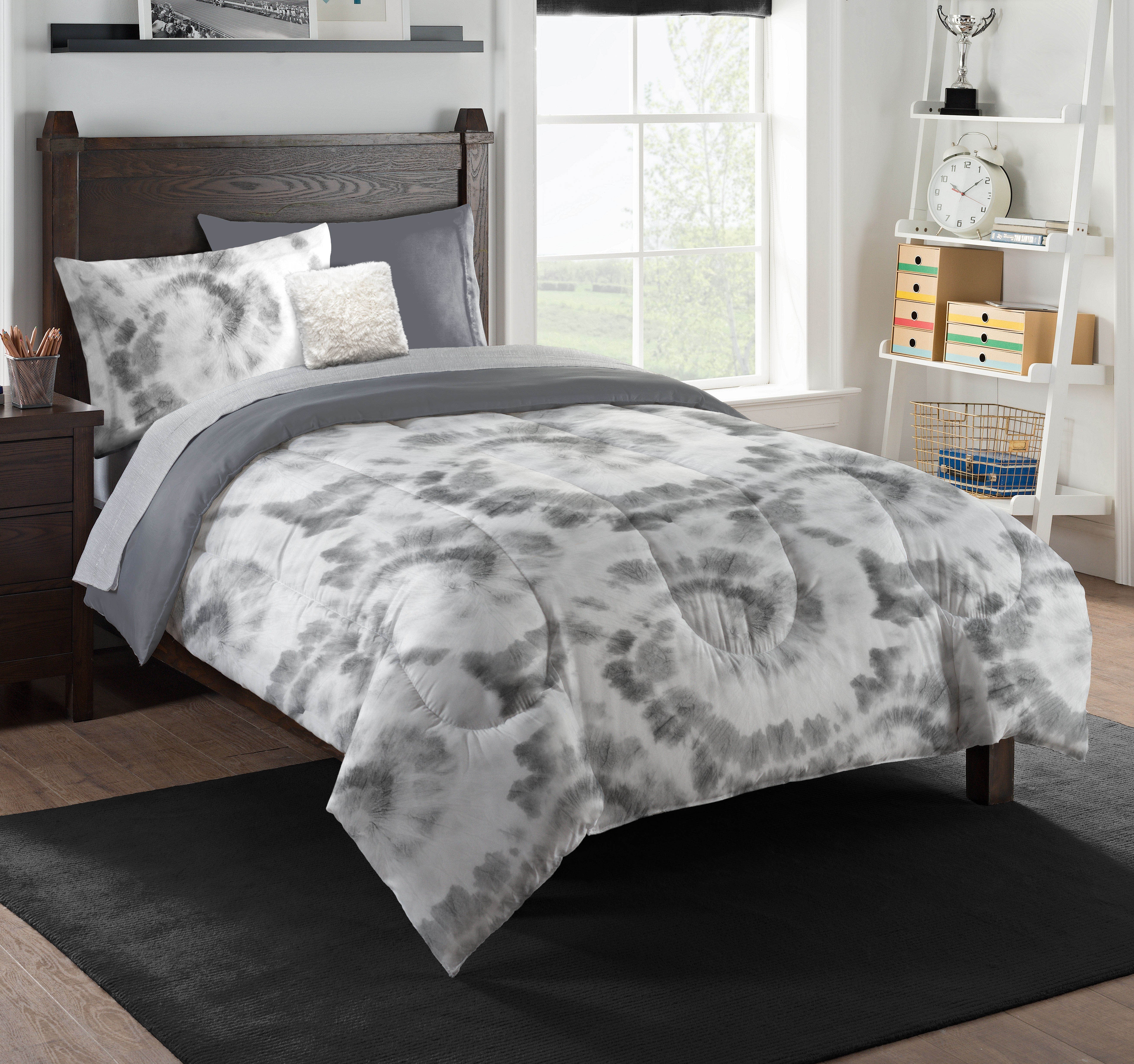 Comforter is grey tie-dye with solid grey reverse; sheets are grey with white dots; decorative pillow is faux fur