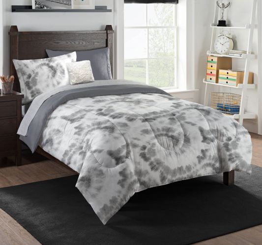 Drift off to sleep in this Subtle Shibori 6-Piece Twin Bed Set with Decorative Pillow by TheNorthwest. You'll never want to get out of bed in the morning! This 66"x 86" comforter comes with one 66"x 96" flat sheet, one 39"x 75" fitted sheet with a 12" pocket, one 20"x 26" sham, one standard-size pillowcase (20"x 30"), and one 16"x 16" decorative pillow, perfect for any bedroom. The front of the comforter is grey tie-dye, while the reverse is solid grey. The sheets are grey with white dots, and the decorative pillow is faux fur. Sleep well in this soft and cozy bedding set.