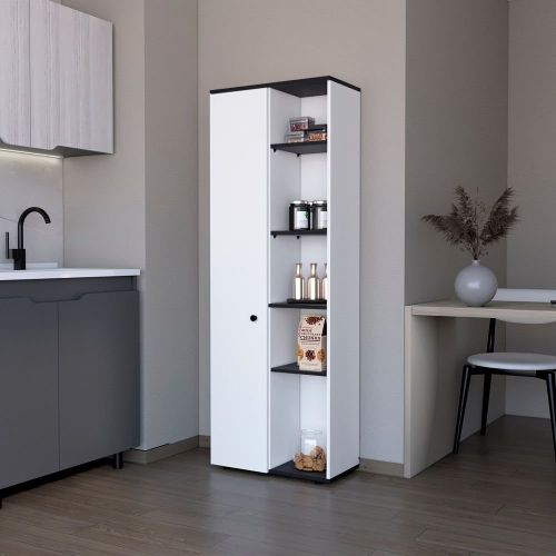 Maximize your kitchen's style and storage with the Kitchen Pantry Lane. This cabinet features black finish shelves of various heights, including 9.2", 11.7", 13.8", and 16.1", to fit all your essentials perfectly. Its sleek white finish and compact design make it the perfect addition to any modern kitchen.Dimensions: Height: 66.9'Width: 23.6' Depth: 11.8'Furniture Type: Ready to assemble (full assembly required).Certifications: CARB phase II compliant – TSCA Title VI Compliant.Warranty: 1-year warranty coverage in wooden parts- 1-year warranty coverage in hardware pieces since its manufacturing date is found in the lot number printed in the product box.Shipment details: Free shipping to the 48 contiguous states - delivery time: Between 2 and 5 days, depending on the customer's location, season, and weather factors.Other details: This product does not include decorative or background elements; Check that the box is in good condition and well packed and check with the help of the manual that the corresponding parts have been included; For more information regarding warranty, shipment details, cancellations, returns & replacement parts go to the bottom section of our website to learn more; Installation & Assembly Instructions included.