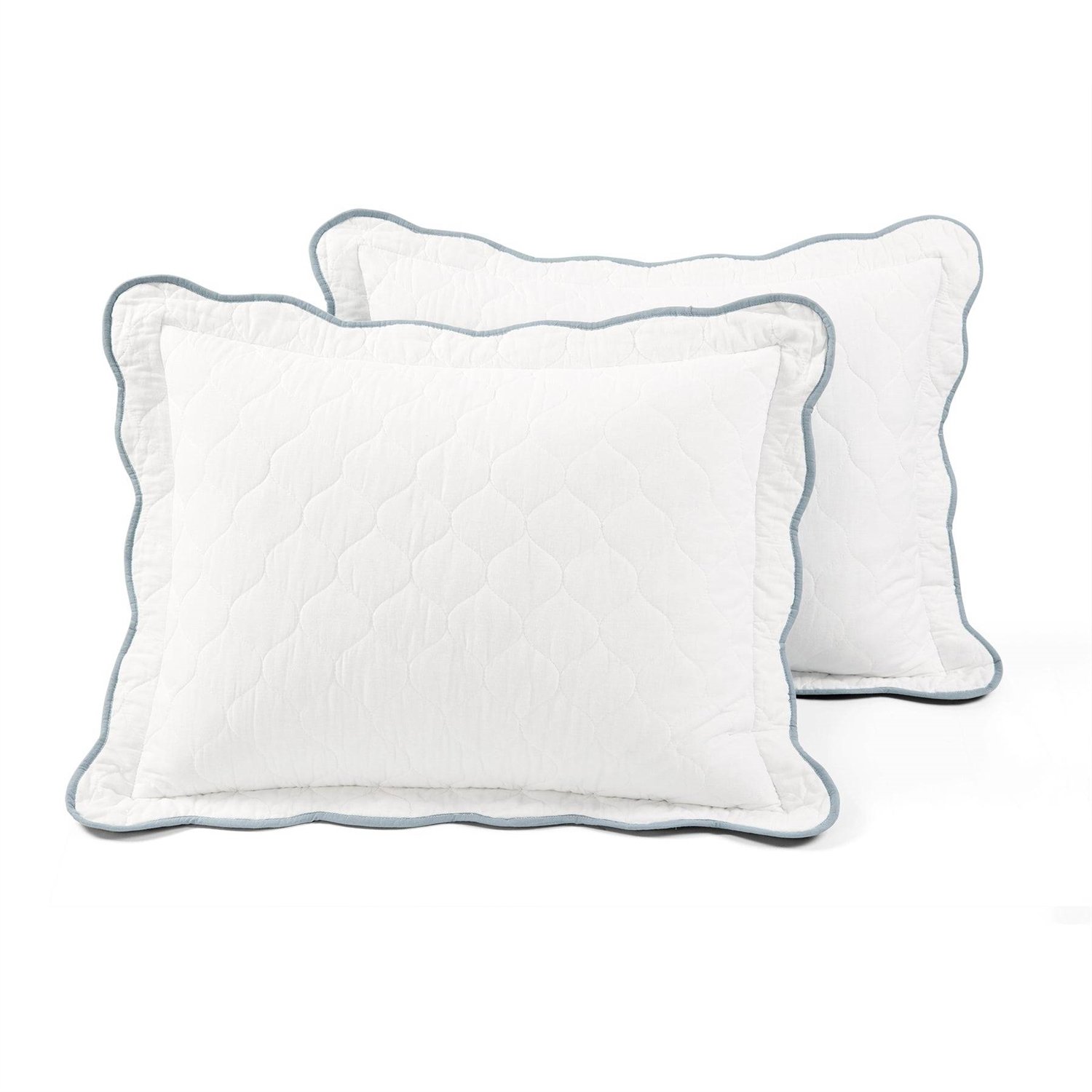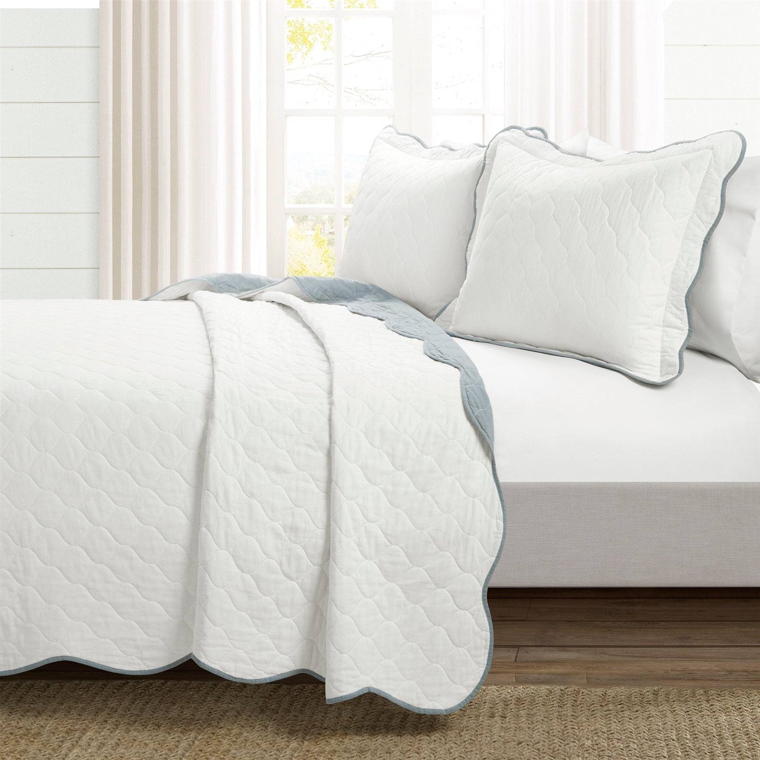 King/Cal King White Blue Scalloped Edge Reversible Thin Light Quilt Set