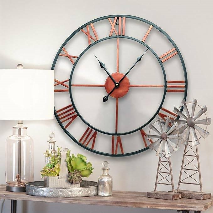 This Decorative 18.5-inch Roman Numerals Silent Non-Ticking Wall Clock in Red is an oversized iron wall clock with European retro style and no frame surface. Enjoy a vintage display on the wall with a fashion pattern available, best decoration. Diameter: 18.5î(47cm) Classic and elegant and looks great on the wall of the living room, bedroom, kitchen, hallway, office, study, cafe, hotel, restaurant etc. Handmade iron metal, classic industrial Roman Numerals, with hand painted vintage color. Famous Qualify Quartz Sweep Movement and no second design guarantees accurate time & absolutely silent environment. Recommended AA ordinary Carbon Zinc or Heavy Duty battery (NOT Included), excluding Alkaline battery.