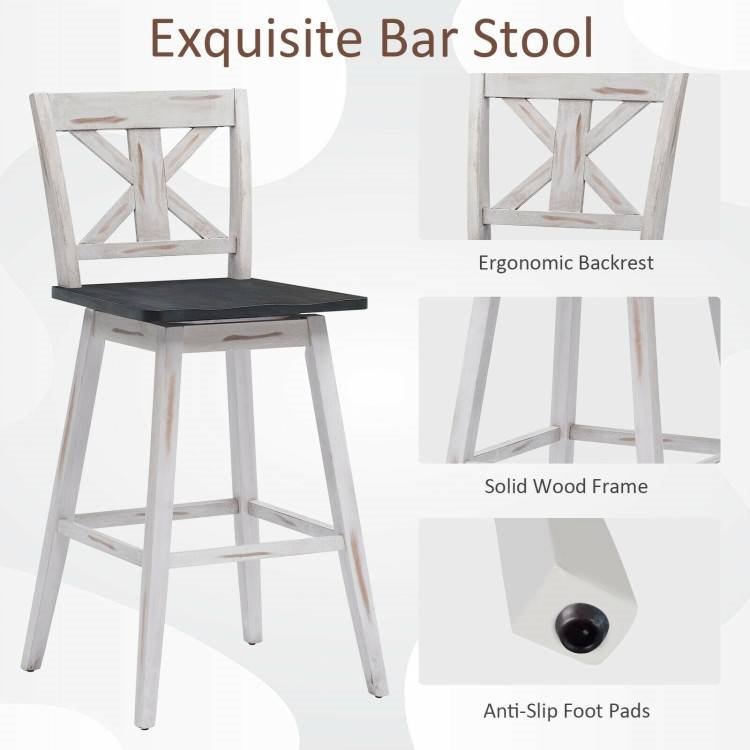 This Set of 2 White Wood 29-in Modern Kitchen Dining Farmhouse Swivel Seat Barstools is made of premium rubberwood and features excellent sturdiness and durability. Therefore, the overall weight capacity of each bar stool has been improved to 214 lbs and you can use the set for a long time. The backrest is designed to be ergonomic and can perfectly fit your back lines. Meanwhile, the seat of the barstool also adopts a curved design, fitting your hips. In this way, your body will be well supported and fatigue can be relieved. Even sitting for a long time you will not feel very tired. The special thing is that the seat is a 360‚àû swivel and you can spin quietly. Thanks to this feature, you can talk to your guests in different directions conveniently. Moreover, there are 2 bar stools in this set, which can meet your daily needs. In addition to your home kitchen, the bar stool set can also be placed in restaurants, bars, and bistros. Meanwhile, with a vintage design, the bar stools can also become a wonderful decoration. The set will bring a sense of fashion and freshness to your home. All needed manuals and accessories are included in the package. With these necessary tools, you can easily assemble the bar stool set. The overall dimension of each stool is 20" x 20" x 43" (L x W x H) and the seat is 29" high. During daily life, you only need to wipe it with a damp cloth regularly.