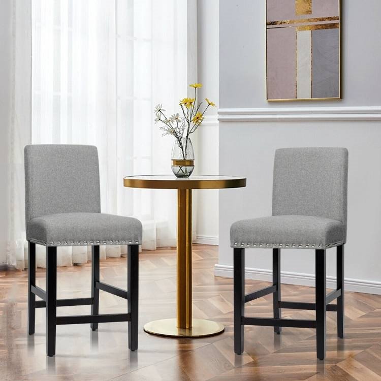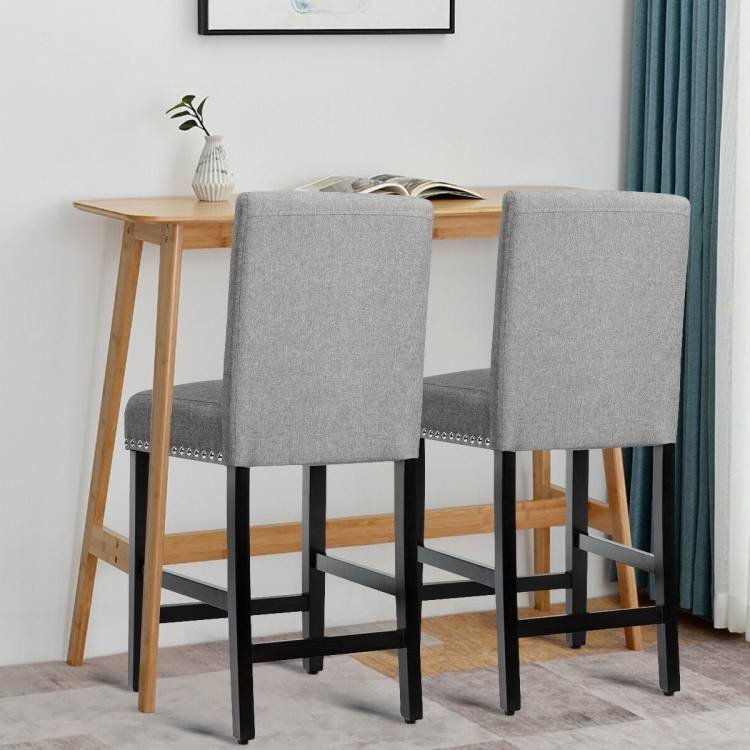 This Set of 2 Modern Kitchen Dining Barstools w/ Black Wood Legs and Grey Linen Seat would be a great addition to your home. The soft cushions of the backrest offer great softness, much more than ordinary bar stools. As well, the interior spring beneath the seat makes for great elasticity and support. The extra breathable linen fabric is amazingly durable and will provide lasting comfort. No matter how tall you are or how long your legs are, these barstool allow you to sit comfortably. The curved backrest is designed to alleviate back strain and provide extra support, while the wide seat is designed to cater to all manner of people ñ perfect for commercial as well as in-home use. The wood legs feature great sturdiness and enable these barstools to provide firm support. The 4 bars connecting the legs provide a footrest as well as adding to the structural integrity of the stools. Plus, there is no need to worry about any wobbling as the adjustable foot pads provide stability even on uneven floors. The various rivets around the seat add an aesthetic beauty to these bar stools. The stylish appearance makes these a perfect complement to either your dining table or kitchen counter. Use these bar stools to enjoy a drink or as dining chairs to entertain guests. The assembly process is a breeze for anyone thanks to the simple structure and easy-to-understand instructions. Requiring less time and effort, the assembly process is much easier than that of other bar stools. In addition, the solid construction provides great stability and a long life span.