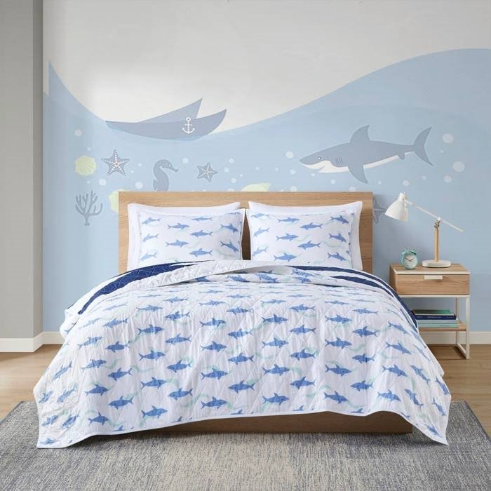 This Full/Queen 3 Piece Coastal Reversible Navy/White Sharks Cotton Quilt Set adds a bright, playful accent to any bedroom with its colorful two-tone navy/white stripe pattern on one side and a bold print on the reverse. It includes a quilt with a noticeable diamond weave along with two coordinating shams.. Each item is made from a breathable cotton fabric that arrives pre-shrunk and is good for all seasons. This set is non-pilling, so it stands up to frequent use and multiple trips through the washing machine.