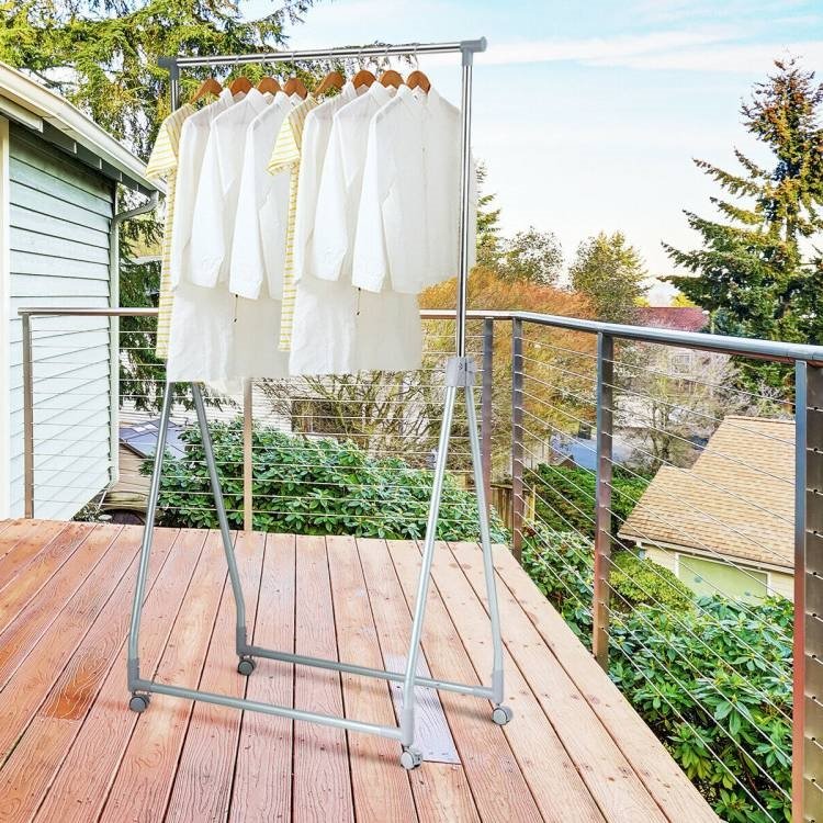 This lightweight and portable garment rack is a right choice for you. This Folding Extendable Metal Garment Rack Clothes Hanging Rod with Lockable Wheels is a great solution to store your shirts, long dresses, shoes and bags. It is perfect for your hallway, bedroom, cloakroom, etc. Made of premium electroplate metal tubes, the garment rack is durable and sturdy which can meet your daily demand of holding clothes. And the rack is not easy to fall because of the triangular structure. The height extendable design can help you to place your long dress which canít be folded and utilize the most space to store your clothes. Thanks to the 2 universal wheels and 2 locking wheels, the rack stands firm and can be moved easily. When not in use, the garment rack can be folded and stored in any compact places, which wonít take up too much of your space. With this flexible extendable garment rack, your living life can be more convenient.