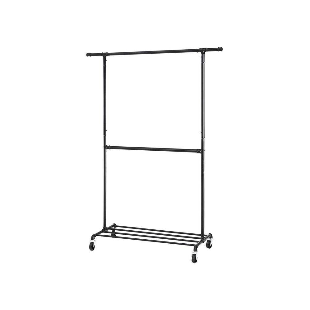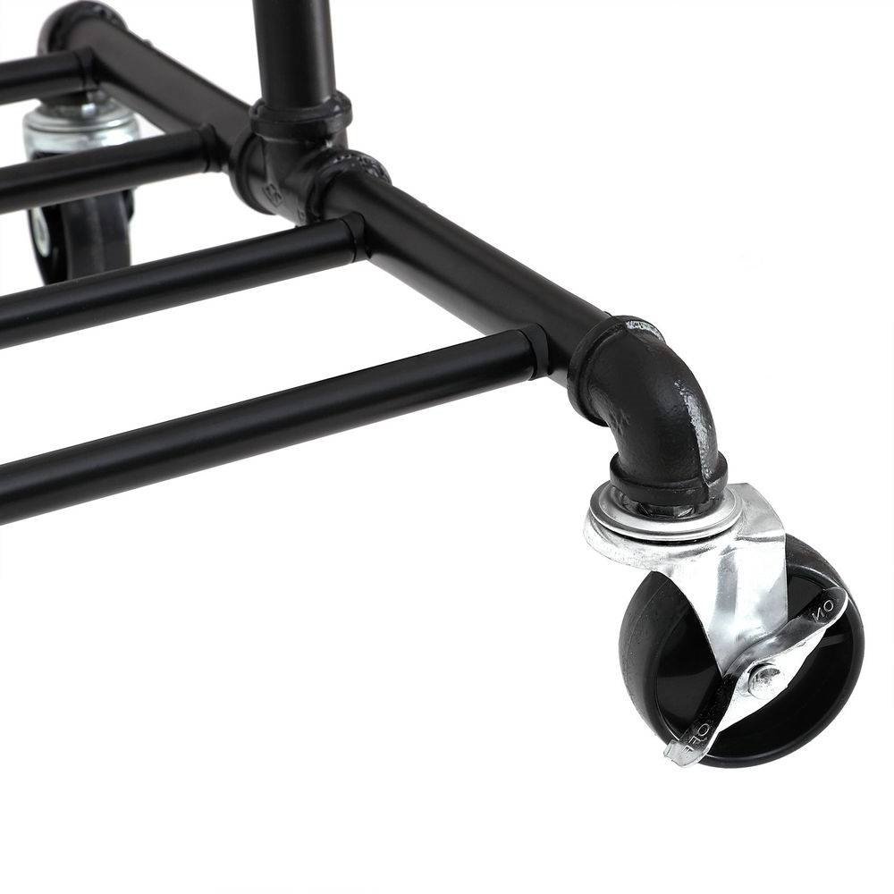 The rustic and industrial design makes this Modern Industrial Style Black Powder Coated Garment Rack with Bottom Hanging Rod a decorative piece for clothing stores, boutiques or retail businesses. With center rail adjustable at 4 heights, it is perfect for keeping long or short garments in an organized way. The wheels make the clothes rack incredibly practical so you can easily transport clothes around your store or studio. Works as a clever solution to store all your piled up clothes without taking up a large amount of floor space. This super cool and stylish pipe garment rack works well in a loft apartment with no closet space. For exceptional built quality, high weight capacity and convenient mobility - look no further than Industrial Pipe Double Rail Garment Rack. No matter if you have a cool rustic apartment or a feminine home, this trendy industrial-inspired clothes rack will be a statement piece, also displays garment stylishly in boutiques or secondary markets. Premium metal tubes ensure stability and superior strength with a 242 lb total weight capacity; for hanging your heaviest winter jackets or chic cocktail dresses, this clothing rack is a must-have. Adjust the middle rail among 4 different heights (while the total height remains fixed), hang coats or long dresses on the top rail, and ready shoes or bags on the bottom shelfóthis rack keeps everything in one place. Slide this clothes rack with 4 wheels to a dressing mirror for checking out your outfit, lock it in place when you complete your morning routine, or roll it around backstage for handling numerous costume changes. Assembly shouldnít be an annoying taskówith clear instructions, labeled parts, and assembly tools included, youíll have this clothes rack set up before you know it.