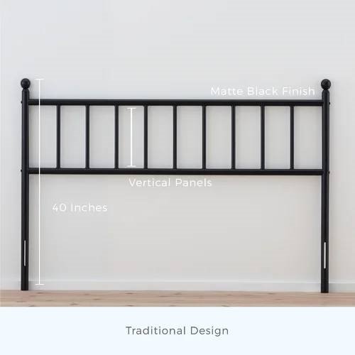 This Queen size Traditional Farmhouse Headboard in Matte Black Metal Finish helps complete your bedroom ensemble, with its sleek shape and traditional design. It's made from metal in a black matte finish, and it has open vertical slats and decorative finials that fit well within your space ó no matter the style of your room or its color palette. This headboard is 40" tall when measured with both legs. Plus, you can easily mount it to your bed frame ó all hardware and plates included.