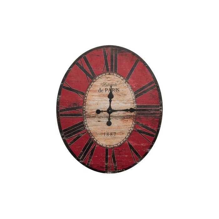 The Red Oversized Distressed Paris Wood Wall Clock is oval shaped and full of old world charm. Why settle for a simple wall clock to merely ensure the time. Bring both function and Paris flair to your space with this wall clock. It showcases a typographic motif in the center. This wooden wall clock is large enough to become an eye catching focal point in any room. The classy style of this clock is the epitome of elegance from the simple colors to the Roman numerals surrounding its edge. This oval wooden clock will keep track of your time and add farmhouse appeal to your wall decor.